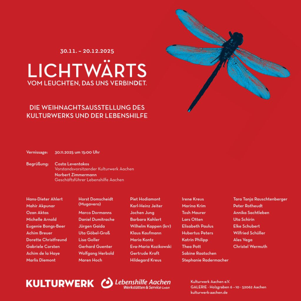 „Lichtwärts – vom Leuchten, das uns verbindet“ ist der Titel der neuen Ausstellung des Kulturwerks Aachen. 48 Kunstschaffende zeigen vom 30. 11. bis 20.12.25 ihre Werke. Ich freue mich, ebenfalls mit einem Bild vertreten zu sein.