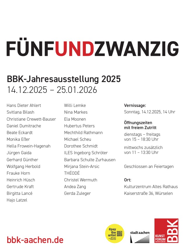 Die diesjährige BBK-Jahresausstellung steht unter dem Motto „FÜNFUNDZWANZIG“. Sie findet im Kulturzentrum Altes Rathaus, Kaiserstr. 36, Würselen bis zum 25. Januar statt. 29 Kunstschaffende nehmen daran teil. Ich freue mich, ebenfalls mit einem Werk dabei zu sein. Die Eröffnung der Ausstellung ist am Sonntag, den 14. Dezember um 14:00 Uhr. Herzlich willkommen.